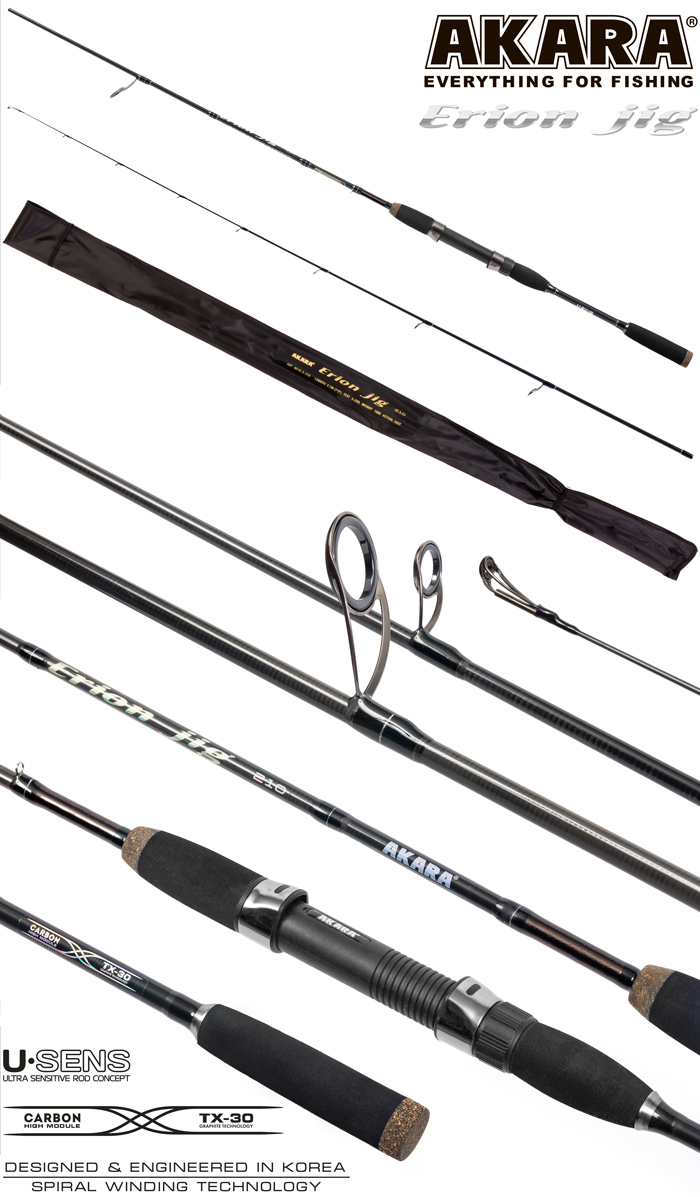Обновленная линейка спиннингов Akara Erion Jig TX-30 включает в себя четыре модели бланков с разными тестами по приманкам (2 – 8, 3 – 12, 5 – 25, 10 – 30 грамм), и в разных длинах (1,98, 2,10, 2,28, 2,48, 2,70 метров) каждый. Спиннинги изготовлены из графита марки TX-30 японского концерна Toray и оснащены пропускными кольцами Kujira Super Contact ZrO2. Данные спиннинги позиционируются как джиговые (благодаря очень информативному бланку), но при этом отлично работают и с другими типами приманок. Имеют удобный катушкодержатель и разнесенную EVA – рукоять. В зависимости от длины позволяют ловлю как с берега, так и с лодки.