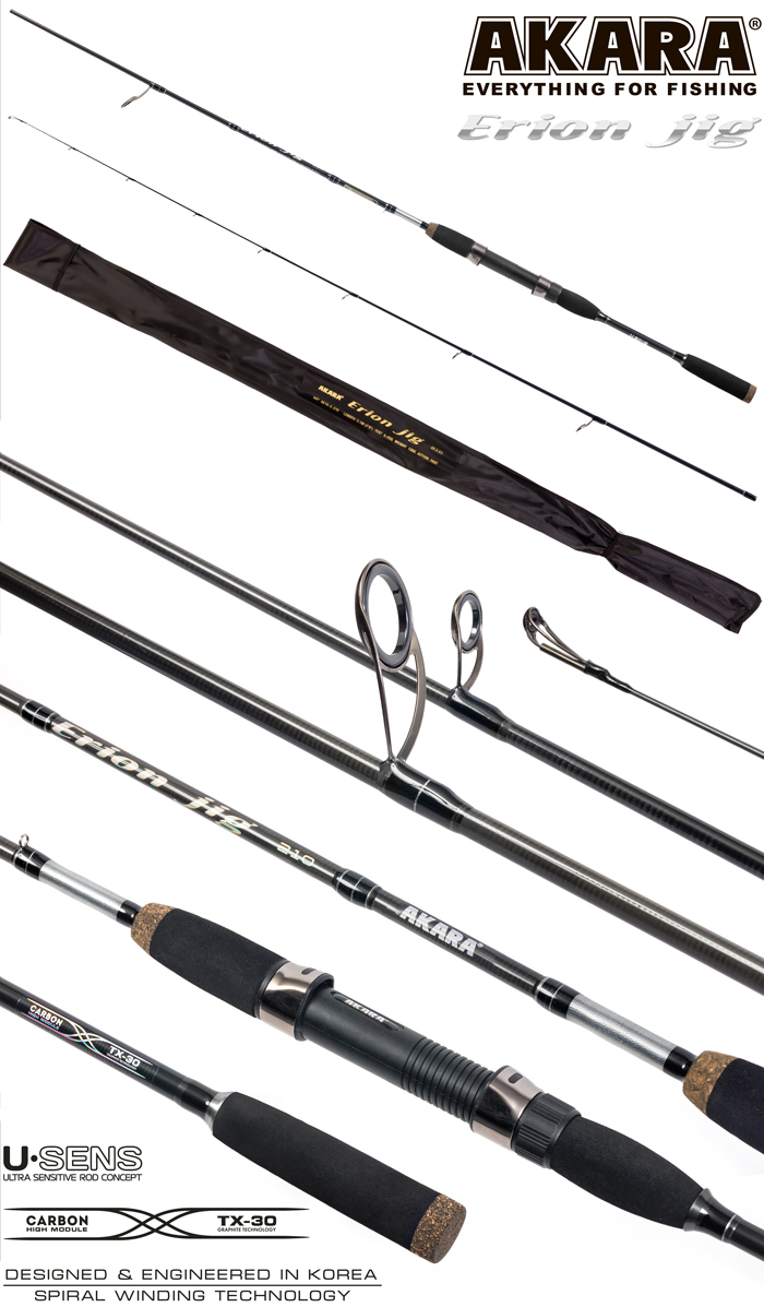 Обновленная линейка спиннингов Akara Erion Jig TX-30 включает в себя четыре модели бланков с разными тестами по приманкам (2 – 8, 3 – 12, 5 – 25, 10 – 30 грамм), и в разных длинах (1,98, 2,10, 2,28, 2,48, 2,70 метров) каждый. Спиннинги изготовлены из графита марки TX-30 японского концерна Toray и оснащены пропускными кольцами Kujira Super Contact ZrO2. Данные спиннинги позиционируются как джиговые (благодаря очень информативному бланку), но при этом отлично работают и с другими типами приманок. Имеют удобный катушкодержатель и разнесенную EVA – рукоять. В зависимости от длины позволяют ловлю как с берега, так и с лодки.