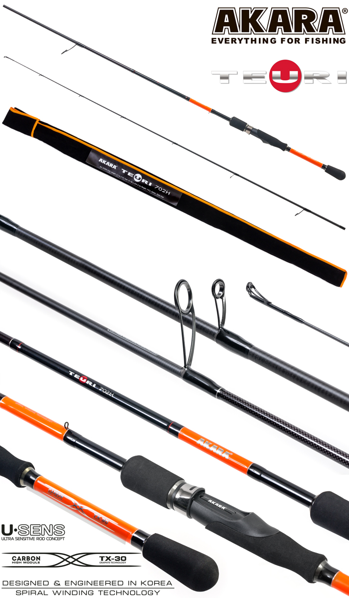 Обновление в модельном ряду угольных спиннингов от Akara — серия Teuri. В линейке представлены, как спиннинги для ультра-лайта, так и удилища для тяжелого джига (heavy jig). Благодаря использованию графита концерна Toray TX-30 (40-ton) и инновационным технологиям плетения бланка спиннинг обладает повышенной чувствительностью при проводке, что делает его незаменимым при контактных видах ловли: джиг, твич, ловля на техасскую оснастку и с отводным поводком. При производстве бланка спиннинга использована технология UPIT. Расстановка колец произведена по технологии New Guide System, позволяющая оптимально расположить кольца на бланке, определить их количество и размер (вес). Облегчённые кольца Kujira XR Long Super Hard ZrO2 (1600-1800H, kg/mm2).